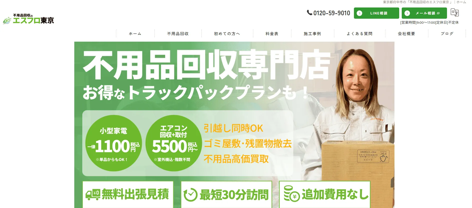 不用品回収のエスフロ東京 | 東京都府中市若松町 | ◎最短15分 | 〇 | ☆☆☆☆☆ |