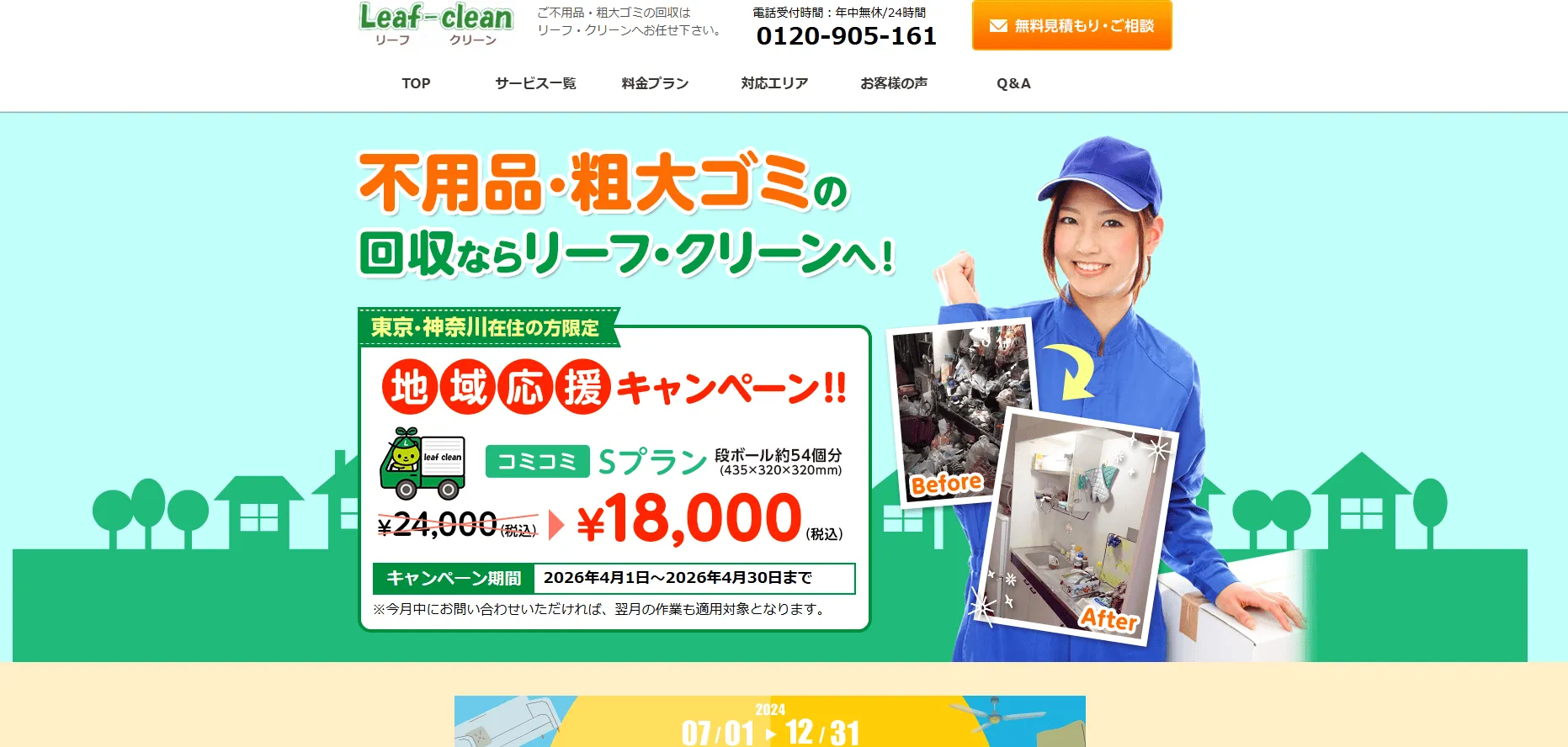 年中無休・24時間受付に対応しているのが特徴の不用品回収業者。軽トラックや2トントラックなどのパックプランが用意されており、回収量に応じた柔軟な依頼が可能です。